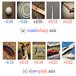 Quantifying the associations between images and adjectives, i.e., how much the visual characteristics of an image are connected with a certain adjective, is important for better image understanding. For instance, the appearance of a kitten can be associated with adjectives such as ``soft'', ``small'', and ``cute'' rather than the opposite ``hard'', ``large'', and ``scary''. Thus, giving scores for a kitten photo considering the degree of its association with each antonym adjective pair (termed adjective axis, e.g., ``round'' vs. ``sharp'') aids in understanding the image content and its atmosphere. Existing methods rely on subjective human engagement, making it difficult to estimate the association of images with arbitrary adjective axes in a single framework. To enable the extension to arbitrary axes, we explore the use of large-scale pretrained models, including Large Language Models (LLMs) and Vision Language Models (VLMs). In the proposed training-free framework, users only need to specify a pair of antonym nouns that negatively and positively describe the target axis (e.g., ``roundness'' and ``sharpness''). Evaluation confirms that the proposed framework can predict negative and positive associations between adjectives and images as correctly as the manually-assisted comparative, also highlighting the pros and cons of utilizing the VLM's textual or visual embedding for specific types of adjective axes. Furthermore, computing the similarities among four adjective axes unveils how the proposed framework connects them with each other, such as its tendency to regard a sharp object as being small, hard, and, quick in motion.